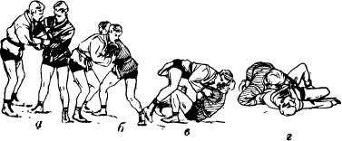 В некоторых случаях можно нападать на противника, не срывая его оборонительных захватов. Чтобы сделать такое нападение, нужно сблизиться с противником посредством ряда специальных подходов к броскам. Если, например, противник захватил ваши рукава или плечики куртки и не подпускает к себе, можно сблизиться с ним путем перекоса прямоугольника, образованного четырьмя руками и двумя туловищами самбистов. Для этого нужно, сделав шаг левой ногой вперед и влево, сильно потянуть обеими руками вправо. Противник не сумеет удержать прежнее расположение своих рук по отношению к туловищу, между руками и двумя туловищами вместо четырех прямых образуется два острых и два тупых угла. Сближение с противником произойдет изза уменьшения высоты четырехугольника. С этим сближением удобно проводить заднюю подножку, отхват и особенно заднюю коленную подсечку. Если противник захватил одежду на ваших рукавах или плечиках куртки и не подпускает вас к себе, то можно сблизиться с ним путем приседания, наклона туловища и небольшого шага вперед. В этом случае противник, не имея возможности удержать на вытянутых руках ваш вес, опустит руки. Прямоугольник, образованный руками, туловищами самбистов и ковром, превратится в четырехугольник, высота которого будет меньше высоты прямоугольника. Этото и позволяет вашему туловищу приблизиться к туловищу противника и особенно вашим рукам к его ногам. С этим сближением удобно проводить броски с захватом двух ног, а также броски с захватом одной ноги.