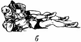 Если же противник, находясь на удержании со стороны головы, сцепил руки за вашей спиной, перейдите в положение сидя возле левого бока противника и, прижав правой ногой левую ногу противника к ковру, проведите выкручивание плеча обратным подниманием локтя (рис. 6).
