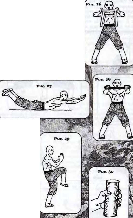 Опора только на носки ступней и на кулаки, расположенные на расстоянии ширины плеч. Нога и туловище составляют одну прямую. Опускайтесь и поднимайтесь, сгибая и разгибая руки. Постарайтесь отталкиваться от опорной поверхности с силой, так, чтобы кулаки отрывались от нее: подпрыгивайте на кулаках (рис. 31). На вдохе, когда опускаетесь, сосредоточьте ци в даньтянь; на выдохе, когда подымаетесь, направляйте ци в руки.