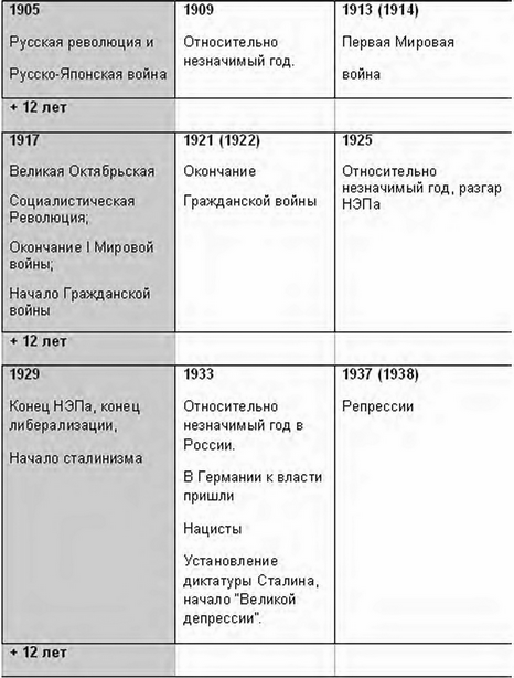 Начало второй четырехлетней фазы - менее активно. Третьей - еще слабее. Затем опять мощный скачок и так далее. Таким образом, 12-летние циклы всегда отмечены какими-то эпохальными событиями.