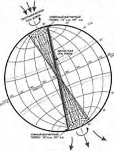 Магнитная ось это линия с максимальной напряженностью магнитного поля. Внутри полевого гиперболоида все поля как бы свиты в жгут. Максимальная плотность «жгута» располагается в зоне фокальной плоскости гиперболоида. Обращает на себя внимание двойная асимметрия поверхности: с одной стороны, она смещена внутри тела Земли в сторону Тихого океана, с другой ее фокальная плоскость смещена к северу на 25-30° У обоих полюсов образуются как бы раскрытия гиперболоида, которые можно оценить по широтам выхода гиперболоида на поверхность. В зоне Северного полюса это 78° с.ш., т.е. угол раскрытия составляет около 24° (12x2), а со стороны Южного полюса это 66° ю.ш., и угол раскрытия составляет около 48° (24x2). При таком соотношении можно себе представить, насколько более плотным является поток с северной стороны.