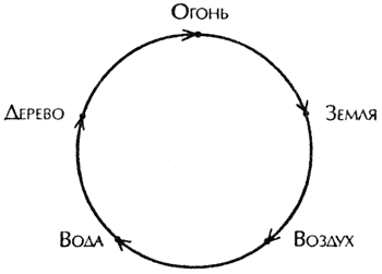 Четвертый момент, необходимый для нашей диагностики, основан на китайской медицине. В ней известно, что стихия Огонь питает стихию Земля, Земля питает Воздух, Воздух Воду, Вода Дерево, а Дерево Огонь (рис. 3). Стихия Дерево соответствует биологической жизни нашей планеты. Считается, что Огонь, Земля, Воздух и Вода присущи всей Вселенной, а стихия Дерево является особой энергией нашего земного существования.