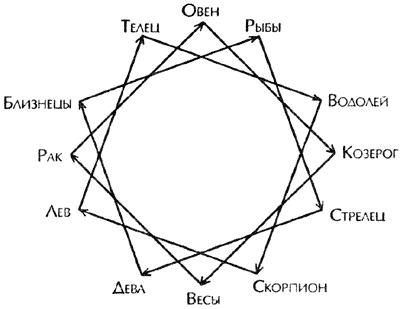 Третье, на что мы будем ориентироваться в своей диагностике, отображено на рисунке 2. Дело в том, что в одной из астрологических систем говорится: человек за одно воплощение, развиваясь, меняет свой характер, постепенно приобретая черты другого зодиакального знака. Так, например, Скорпион, идя по пути развития своей души, неизбежно приобретает качества Льва. (Лев Тельца, Телец Водолея и т. д.).