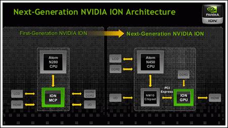 Пожалуй, самое важное событие CeBIT 2010 презентация платформы NVIDIA Ion "следующего поколения". Как и в случае с "системой на чипе" Tegra, NVIDIA почему-то предпочла не использовать в названии второй версии платформы цифру 2, заменив её на расплывчатое определение Next Generation. Новый «Ион» в два раза производительнее «Иона» старого. Кроме того, по утверждению NVIDIA, он в пятнадцать раз быстрее графических решений Intel, предназначенных для нетбуков и миниатюрных настольных компьютеров.