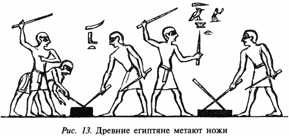 В более цивилизованные времена нож, как метательный снаряд, занял место камня. Мы знаем, что древние египтяне тренировались на деревянном чурбане, а германские чемпионы, сидя на скамьях, вели дуэли путем метания друг в друга трех ножей, которые следовало отбить щитом. Современные испанцы с детства начинали учиться искусству метания ножа-кучильо или фальчиона .