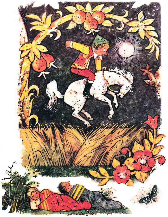 На вторую ночь отправились караулить. Старшие братья набрали с собой пирогов, вина, жареного мяса. Замарашка сухих корочек. Те ели, пили, пока не перепились, А этот на яблоньке-дичке грыз сухие корочки и кислые яблочки. В полночь примчались два крылатых коня. Один сразу к яблоньке, боком об нее трется. А Замарашка с дерева скок! И уже у него на спине сидит! Конь с борозды на борозду, с межи на межу, с полосы на полосу мечется! Но Замарашка вцепился, не отпускает. Конь и говорит: