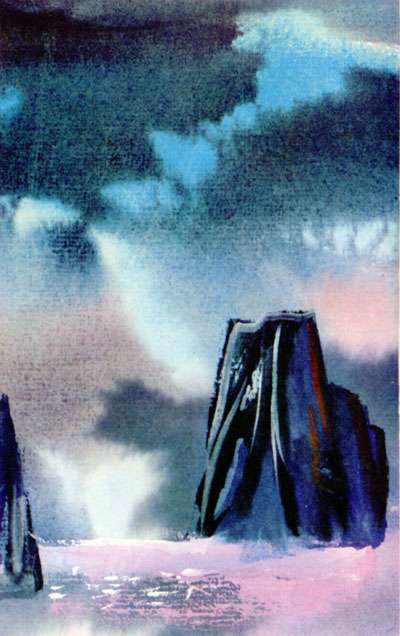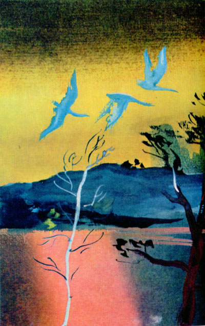И взлетают вверх золотыми и серебряными тучками. Летят они кучей, в беспорядке. Но им легко лететь за длинноногими журавлями, которые несутся впереди и рассекают воздух. И еще говорят, что когда маленькие птички устают лететь через широкое синее море, длинноногие журавли берут их на могучие спины и летят на юг и поют без конца: