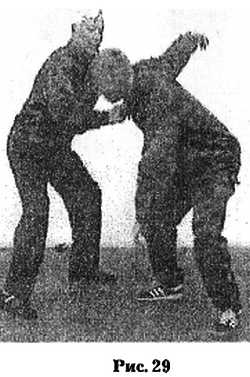 Затем наклоняем его корпус вперед для смещения проекции его вектора массы к краю площади опоры. Левой рукой захватываем правую руку противника в целях создания пары сил «горло правая рука» (рис. 29).