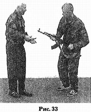 Аналогично угрозе противника пистолетом эта ситуация также осложняется тем, что огнестрельное оружие резко уменьшает шансы защищающегося по времени на исправление собственных ошибочных психологических и технических действий. Основные требования к началу эффективных двигательных действий такие, как и в случае защиты от угрозы пистолетом (см. описание к рис. 17).