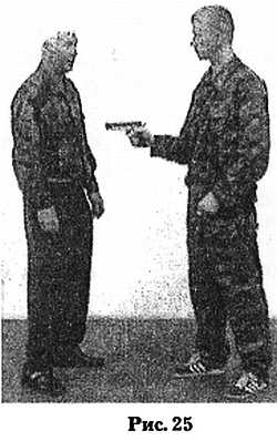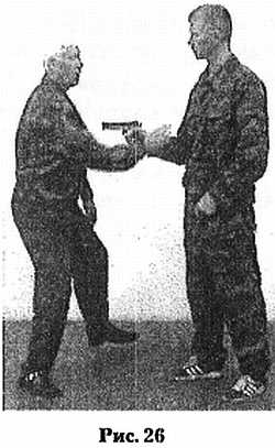 Выбив оружие, подготавливаем атаку ребром ладони уязвимого места противника, в конкретной ситуации его горла, постоянно осуществляя контроль за возможными его перемещениями (рис. 27).