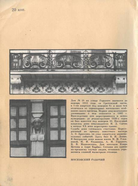 Судьба бывшего сытинского дома сложилась счастливо. Перестроенный по проекту видного мастера по заказу известного книгоиздателя-просветителя И. Д. Сытина, дом за восемь десятилетий стал свидетелем знаменательных событий. Здесь был В. И. Ленин. В биографию дома вошли имена М.'И. Ульяновой, М. И. Калинина, А. М. Горького, В. В. Маяковского. Дом посетили Клара Цеткин, Анри Барбюс и многие другие выдающиеся общественно-политические деятели и деятели культуры. Сегодня этот дом по-прежнему служит людям, оставаясь украшением главной магистрали столицы.