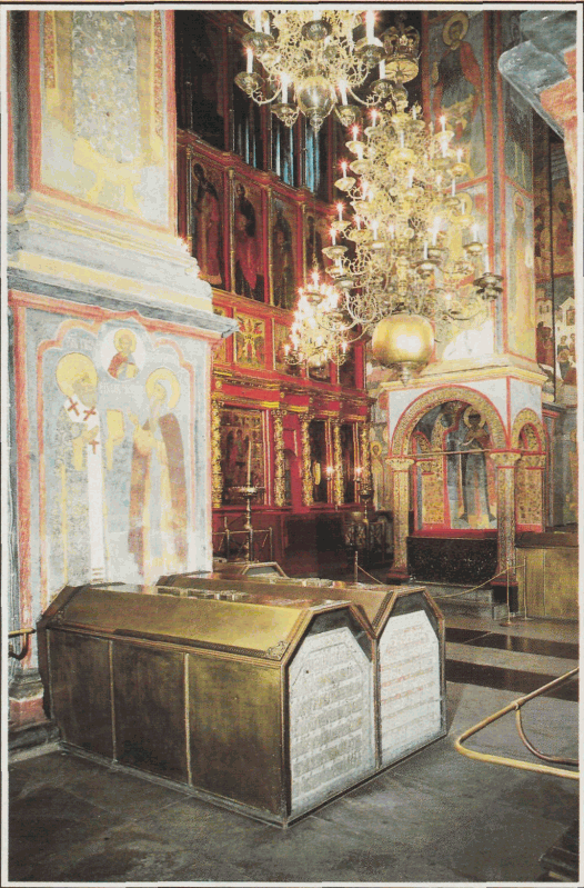 У юго-восточного столпа под белокаменной резной сенью покоится младший сын Ивана Грозного царевич Дмитрий, погибший в 1591 году в Угличе. После разгрома войск самозванца Лже-дмитрия I в 1606 году останки царевича были перенесены в Архангельский собор. Гробницу украшает ажурная решетка - замечательный памятник художественного литья первой трети XVII века. В алтаре собора хранятся мощи святых мучеников князя Михаила Черниговского и боярина Федора, погибших в Золотой Орде в 1245 году.