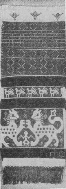 Наряден костюм Са-пожковского района Рязанской области. Это впечатление создает белый шушпан по подолу и рукавам, отделанный широкой яркой полосой закладного ткачества. Черная в крупную клетку панева прекрасно гармонирует с белой Нарядной одеждой. Не только элементами декора, «о и покроем отличается костюм Кадомского района Рязанщины. Характерной его особенностью является «навершник» - безрукавка, которая надевалась поверх рубахи и паневы. Ее отделка необычайно богата: красные полосы браного узора сочетаются с белым холстом и вставками кумача. Рязанский костюм Березовского района тоже имеет своеобразную деталь одежды - «сукман» (белый шерстяной сарафан в складку). Его надевали тоже поверх рубахи и ярко-алой паневы.