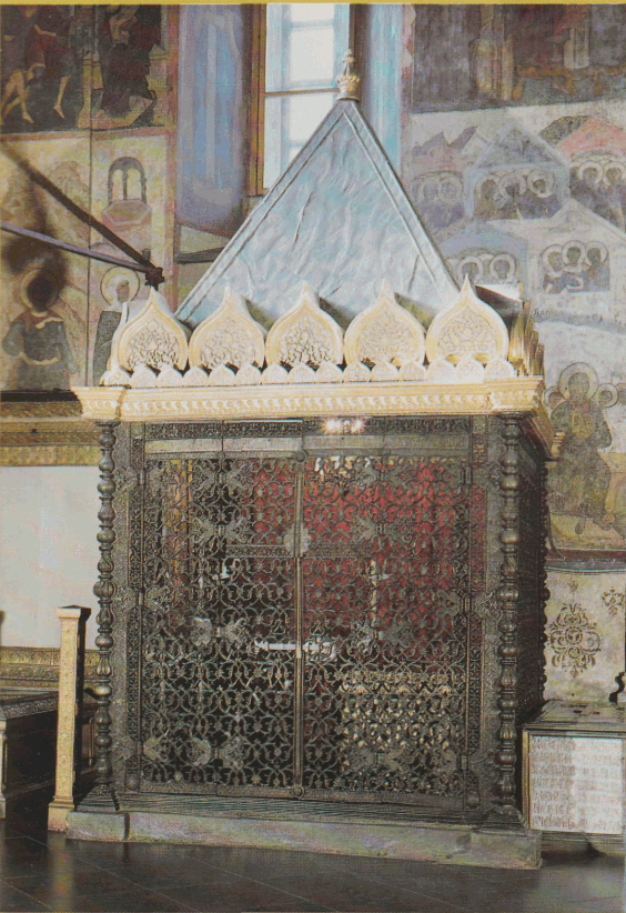 В 1551 году по указу Ивана Грозного было создано царское моленное место, так называемый "Мономахов трон" - шедевр резьбы по дереву. Барельефы на его стенках иллюстрируют легенду о посылке византийским императором киевскому князю Владимиру Мономаху, чьим прямым потомком и наследником считал себя Иван Грозный, царских регалий - шапки Мономаха и барм.