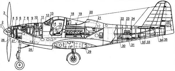 1 кок винта; 2 ствол 37-мм пушки; 3 винт «Аэропроп»; 4 пламегаситель пулемёта; 5 12,7-мм пулемёт; 6 маслобак редуктора; 7 кислородный баллон; 8 патронный ящик пулемёта; 9 гильзоотвод; 10 магазин пушки; 11 расширительный бачок тормозной системы; 12 бронестекло; 13 коллиматорный прицел; 14 ручка управления; 15 рычаг управления двигателем; 16 штурвал управления триммером руля высоты; 17 ручка управления триммером руля направления; 18 приёмник SCR-695A; 19 двигатель «Аллисон» V-1710-93; 20 всасывающий патрубок нагнетателя; 21 отверстие для забора воздуха в двигатель при работе на земле (по правому борту); 22 блок модулятора BC-457A; 23 приёмник BC-453B; 24 входной изолятор антенны; 25 триммер руля направления; 26 редуктор; 27 переднее такелажное отверстие; 28 аккумулятор; 29 заслонки радиаторов; 30 тяга управления рулём высоты; 31 передатчик BC-457A; 32 заднее такелажное отверстие; 33 цепь Галля для управления триммером руля направления; 34 трос управления рулём направления; 35 гибкий валик управления триммером руля направления.