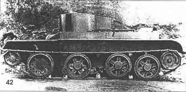 Опытный образец танка БТ-6 без установленного вооружения. Обратите внимание на оригинальную конструкцию люка механика-водителя, хорошо видимую на виде спереди.