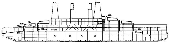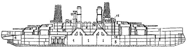 1 котельное отделение; 2 мошинное отделение; 3 отделение турбогенераторов; 4 отделение рулевых приводов; 5 отделение подводных торпедных аппаратов; 6 каземат противоминной батареи (без броневой защиты); 7 башни ГК; 8 шахта светового и вентиляционного люка машинного отделения; 9 каюта командира; 10- штурманская рубка; 11 жилые помещения экипажа; 12 каюты офицеров; 13 опора шлюпочного крана с элеватором подачи боезапаса к 76,2-мм зенитному орудию но верхней площадке; 14- центральный пост; 15- боевая рубка с постом упровления огнем ГК, 16 отделение опреснителей.