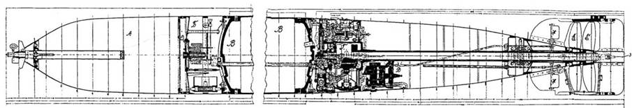 Г. Машинное отдѣленіе; въ этомъ отдѣленіи кромѣ главной машины приводящей въ дзиженіе винты Е Е1 находится рулевая машинка отъ горизонтальныхъ рулей