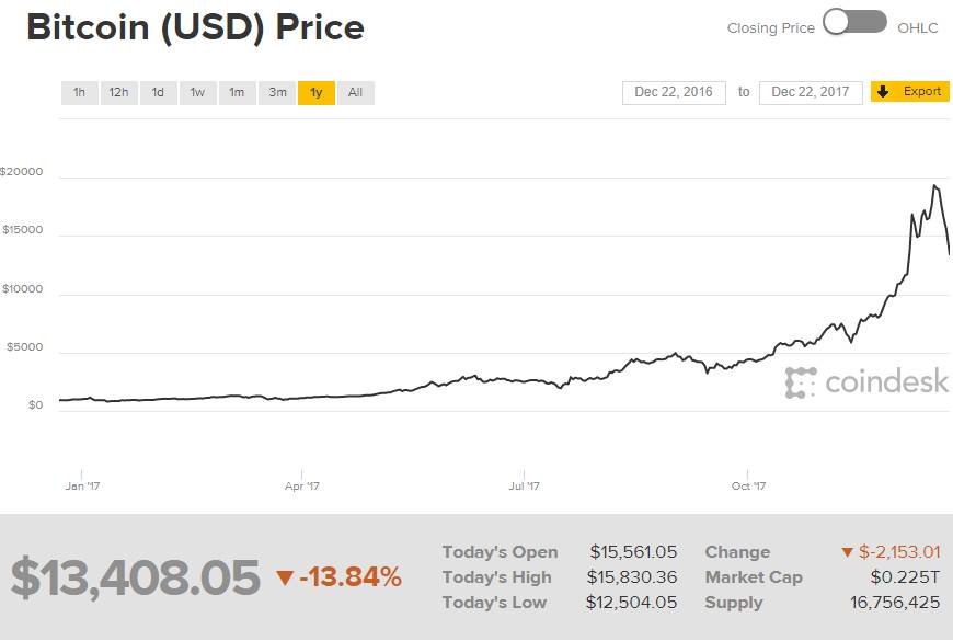 Если посмотреть на приведенный ниже годовой график, то не остаётся сомнений в том, что, несмотря на юридическую неопределённость интерес к инвестиции в Bitcoin росли по экспоненте. Ниже скриншот с сайта Coindesk 22.12.2017.