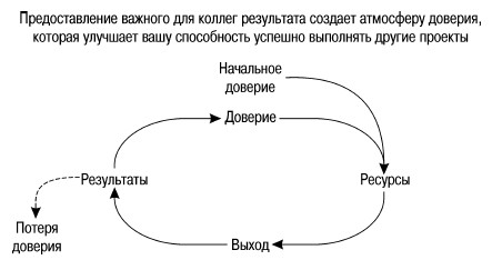 Предоставление важного для коллег результата создает атмосферу доверия, которая улучшает вашу способность успешно выполнять другие проекты ресурсы и разрешение проводить различные ИТ-инициативы. Результаты воплощения этих инициатив зависят от того, какую пользу они приносят компании с точки зрения руководства компании уменьшают или увеличивают доверие к CIO. Весь процесс представляет собой некую виртуозную последовательность или нисходящую спираль. Каждый успех с точки зрения лидеров повышает доверие к CIO, а неуспех или провал снижает это доверие.