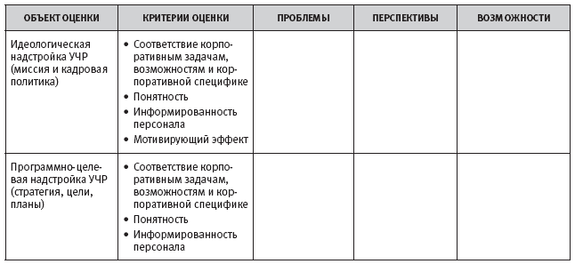 Таблица 2.6.1. Описание корпоративной ситуации с помощью набора объектов и критериев оценки, проблем, перспектив и возможностей в сфере УЧР