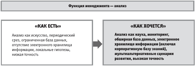Обострение конкурентных войн и глобальные изменения рынка требуют скорейшего достижения «технологичности» анализа, т. е. перевода его на научные рельсы, создания мониторинга как системы постоянного отслеживания ранних и поздних индикаторов деятельности персонала, создания обширной базы данных и грамотно структурированного электронного хранилища информации (включая корпоративную базу знаний). Управленческие решения должны основываться на анализе глубинных (большей частью скрытых) закономерностей, генерироваться на основе имитационного математического моделирования и представляться в виде мультиальтернативных сценариев, должны обеспечивать высокую точность оптимизации и прогноза. Естественно, что такой высокий уровень анализа нуждается в правильной постановке управленческой задачи (на основе