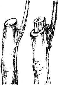 Выломка побегов заменяет вырезку. Если в самом начале развития выявить побеги, способные загустить крону, а также волчковые и всякие другие, которые не могут быть использованы с конкретной пользой, целесообразно их сразу же выломать. Это значительно проще вырезки и менее травматично для растения. Кроме того, растению не придется расходовать силы на формирование веток, которые все равно будут удалены. Побег, достигший длины 510 см, выламывают пальцами с «пяткой», т. е. частичкой древесины. Образовавшаяся при этом ранка быстро затягивается без всякой обработки.