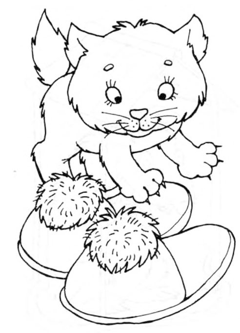 Раскрась картинку цветными карандашами. Расскажи, какого цвета тапки, а какого цвета котёнок.
