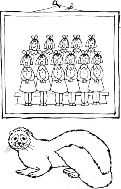 Раскрась картинку цветными карандашами. Расскажи, какого цвета хорь, а какого цвета одежда у детей, поющих в хоре.