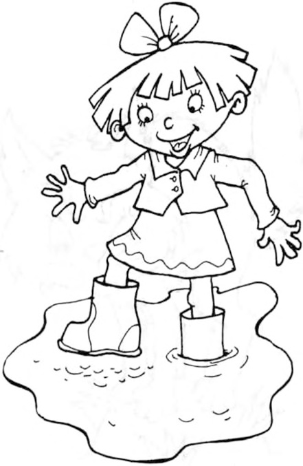Раскрась картинку цветными карандашами. Расскажи, какого цвета лужа, а какого цвета одежда и сапоги у Луши.