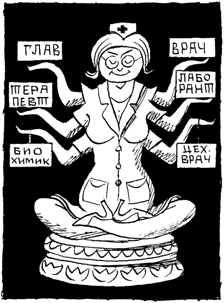 Однако это вызвало кривотолки. Тогда главный врач назначает себя по совместительству лаборантом-биохимиком. А что? Разве не может главврач одновременно руководить медсанчастью, принимать больных в цехе и делать анализы? Конечно, может. Галина Ивановна отлично справлялась со всеми этими обязанностями, получив сверх своей основной зарплаты четыре с половиной тысячи рублей.