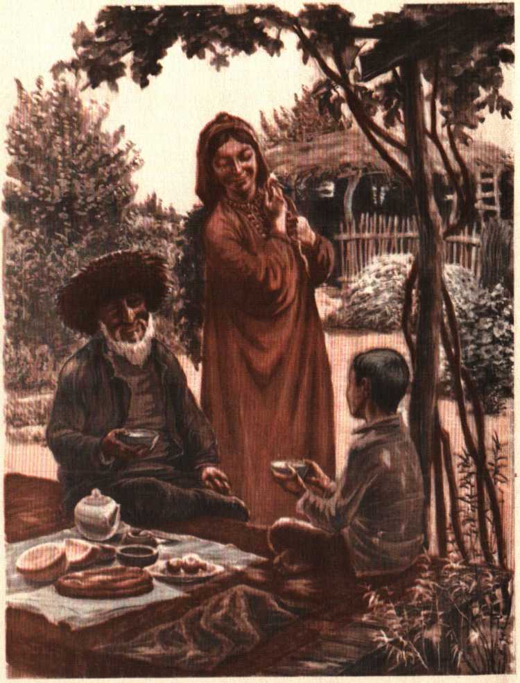 Да ладно, теперь все это позади. Нога давно зажила, и меня выписали из больницы. Я опять могу бегать и прыгать и даже на деревья взбираться. Я бы, наверное, и не вспомнил про больницу, но просто хотел сказать, что можно обойтись без игр. И без еды можно обойтись. Не верите? Однажды к нам в гости приехала моя тетя. Как обычно, она привезла гостинцы. Развязала завязанный в большой узел платок. А там в маленьких узелках и горох, и кишмиш без косточек, и миндаль. Мама только попробовала понемногу от всех гостинцев, а остальное разделила между нами. Старший брат Кервен тогда еще не был солдатом. Он учился не то в шестом, не то в седьмом классе. И сестра Тазегуль тогда еще не была такой взрослой, как сейчас. Только-только начинала косички заплетать. Они торчали в разные стороны, как мышиные хвостики. Теперь совсем другое дело, теперь она взрослая девушка с двумя толстыми косами на груди. При виде гостей смущается, а когда мы с ней одни, важная такая, словно большой начальник. Но тогда и Кервен и Та-зегуль были просто школьниками. А я и вовсе был совсем маленьким, ни в каком классе не учился. Увязался было за братом и сестрой в школу, даже старый букварь Тазегуль взял с собой, а учительница погладила меня по голове и сказала: «Приходи в будущем году». Так я и вернулся с букварем домой. Дома скучно, особенно если нету ребят. И я очень обрадовался приезду тети. Только когда мама стала делить гостинцы, мне досталось меньше, чем Кервену и Тазегуль. Может, и не меньше, но мне так показалось. Я обиделся. Кервен и Тазегуль закричали: «На обиженных воду возят!» и быстренько съели мою долю. А мама, вместо того чтобы отругать их, меня же и упрекнула: