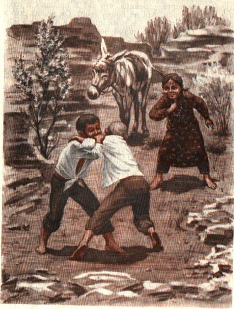 Ата тоже не хотелось оставаться в долгу, он тоже пнул пяткой в землю на моей стороне. Потом и я пнул, потом он Мы подняли целый столб пыли. Не то что черту, мы даже друг друга не видели. Нечаянно наши животы столкнулись. Потом мы стали толкаться грудью. Потом Ата, видимо, надоело толкаться, или, может, Джерен ему что-то сказала: он схватил меня за талию. Я схватил его за шею. Потом я улучил удобный момент и тоже обхватил его за талию. Так начался наш бой. Бой был хоть и суровым, но справедливым, честным. Оказывается, у страха глаза велики, и страшно было до тех пор, пока сражение еще не началось. Мы долго кружились на месте, вцепившись друг в друга. И не падали, и не валили друг друга. Я все ждал, когда же он наконец применит приемы, которым обучился в кожной больнице. Мне очень хотелось, чтобы он один за другим использовал все приемы, которые знал. "Пусть я буду побежден, но зато чему-то научусь", думал я. Но сколько я ни ждал, ничего не дождался. Видимо, он и приемов-то никаких не знал. Только кружил на одном месте. Я понял, что если я сам что-нибудь не предприму, наша борьба будет продолжаться очень долго. "Постой-ка, я сейчас тоже покажу тебе свои приемы". Правда, у меня приемов было мало. Слишком мало. Но верные. Подножка, подброс и третий перекидывание через спину. Но каждый из них надо было применить умело. Например, для того, чтобы подсадить противника на бок, а потом перекинуть его через плечо, он должен быть несколько легче тебя. А Ата по сравнению со мной и потолще, и кости у него потяжелее. А чтобы дать подножку, надо своей ногой притянуть ногу противника. Видимо, Ата тоже знал этот прием. Он присел, словно гиена, и не давал возможности приблизиться к его ноге. А если даже и просунешь ногу меж его ног, все равно, для того чтобы дать подножку, надо хитрость применить. Потому что, когда нога уже зацеплена, оба противника вынуждены распрямиться. У обоих одновременно по одной ноге отрывается от земли. И тогда надо стараться навалиться на противника всей тяжестью. У кого поясница слабее, тот и падает первым. Я выбрал удобный момент, занес свою ногу за его правую ногу. Только Ата склонился, как я резко отдернул свое тело. Он рухнул, словно канар с сеном. И я быстренько уселся на его живот