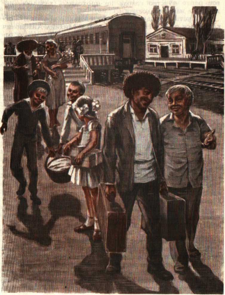 Я приехал на станцию встречать гостя вместе с папой на машине. Мама приготовила мне нарядную вышитую рубаху. На голове у меня новенькая расшитая тюбетейка. Я думаю: "Скорей бы приехал поезд, и я бы увидел этого "высокого" гостя. Правда, как я узнаю его, если даже увижу? Ведь мне не известно, кого мы встречаем. Нет, думаю я, узнаю. Потому что он должен быть высоким".
