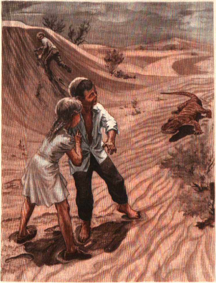 Никто не отзывался. Лиля была готова заплакать. Я сам забеспокоился. В самом деле, куда он подевался? Не варан же его проглотил! И вдруг я увидел Володю. Он стоял на самой вершине бархана. И как он быстро взлетел туда! Даже отсюда было видно, что он очень испуган. Варан куда-то исчез. Я поднял с травы Вовкину треуголку, взял Лилю за руку, и мы тоже вскарабкались на вершину бархана.