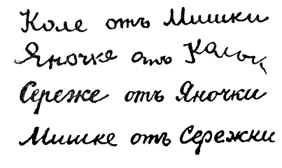 Эта подпись была сделана как-то чудно, словно рука писавшего дергалась и карандаш не полз, а прыгал по бумажке. Буквы стояли неровно: одна выше, другая ниже; буква К отлетела от КОЛЬ, а последняя буква буква И была вовсе не написана.