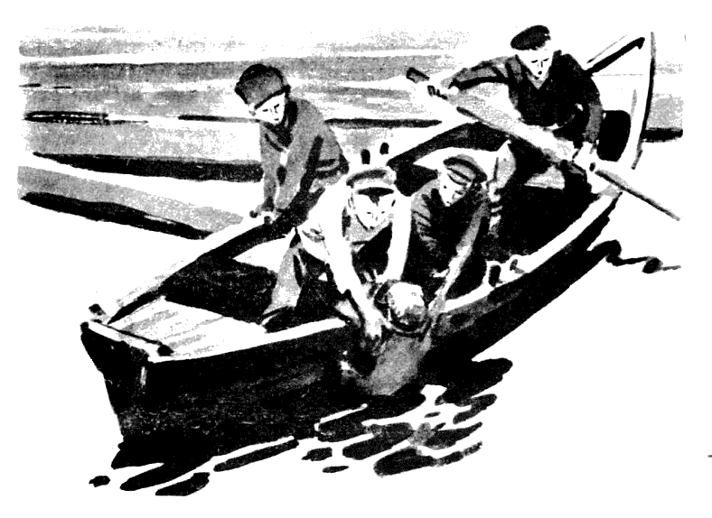 Сережка бросился на нос и стал всматриваться в воду смотреть, откуда вынырнет Мишка. И еще он громко командовал, куда грести.