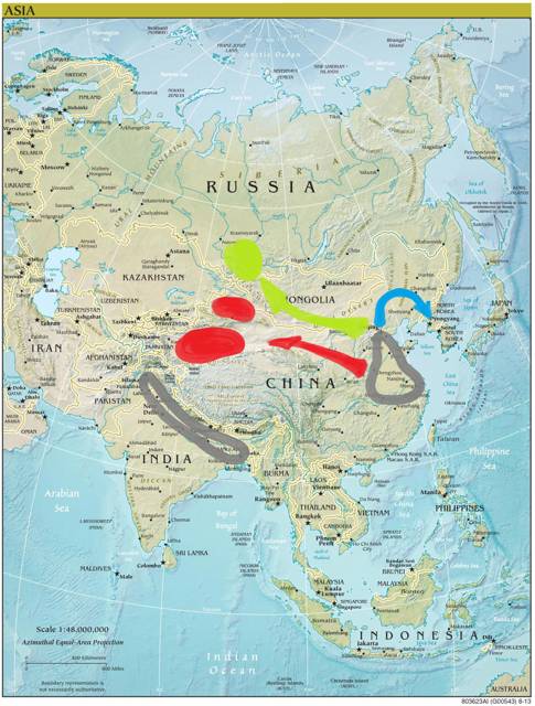Практически одновременно с формированием границ китайского мутного пятна, из его юго-западной части в районе Уханя на огромной скорости вышло нечто, похожее на атмосферный фронт, только огненный, показал ректор по направлению красной стрелки. Оставляя за собой выборочные разрушения и пожары, этот аномальный атмосферный фронт преобразовался в два циклона, сформировавшиеся над Таримской и Джунгарскими впадинами.