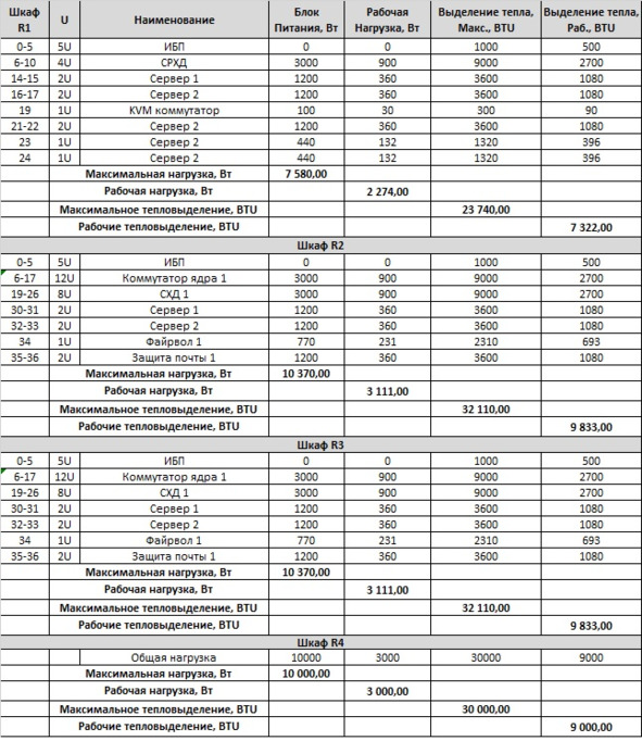 Исходя из таблицы получаем, что для каждой стойки достаточно ИБП мощностью порядка 45 кВт. Подводы для питания стойки должны обеспечить максимальную нагрузку 1011 кВт, а средняя нагрузка стойки порядка 3 кВт. Рабочая мощность охлаждения порядка 35 кBTU, при максимально возможной 120 kBTU. Далее можем принять два варианта системы охлаждения: