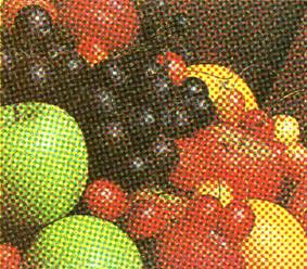 Все цветные репродукции в этой книжке и во многих других напечатаны с использованием цветоделения на три основных цвета (пурпурный, желтый и голубой); во время печатания происходит смешение этих цветов путем последовательного наложения их (механическое смешение). Черный цвет добавляется как контурный или по мере необходимости, а незапечатанная белая бумага дает эффект белого цвета. Если взглянуть на увеличенный фрагмент четырехкрасочного оттиска с близкого и дальнего расстояния, то можно наглядно пронаблюдать эффекты механического и пространственного смешения цветов.