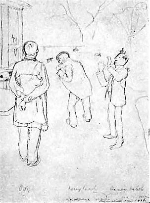 3. На даче в Мартышкино (А. Обер, К. Сомов и В. Нувель, преследуемые осами). 1896