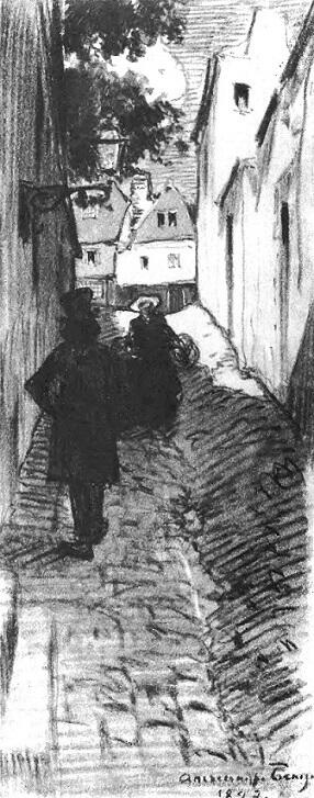 Бенуа продолжает «учительствовать» в своем непрерывно спорящем кружке. Вместе со всей компанией бродит по старинным кварталам Парижа, посещает Национальную библиотеку, осматривает музеи, дворцы, соборы, ездит в Севр, Сен-Клу, Шантильи, Шартр. «Иногда одно его слово, сказанное мимоходом, открывало целый незнакомый мне мир», пишет об этих прогулках Остроумова-Лебедева.22