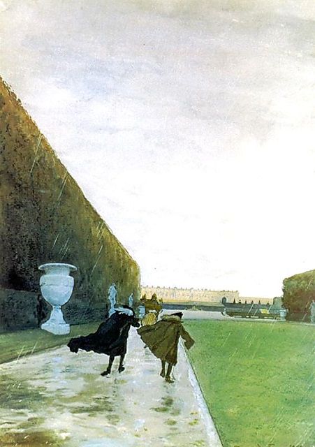 Бенуа пишет темные, мрачные тучи Хлещет косой ливень. Вялые струйки света, прорвавшиеся из хляби небесной, играют вдали, на верхних этажах только что возведенного дворца. Двое придворных тонкие, обтянутые чулками старческие ноги, раздираемые ветром плащи, пудреные парики, с трудом удерживаемые на головах шляпы Мы видим их со спины, неловко шлепающими по мокрой дорожке вслед за портшезом короля мимо стриженых деревьев, мимо белых мраморных ваз туда, во дворец. Образы людей здесь обытовлены, беспокойные силуэты и мелкий, дробный ритм движений контрастируют с величавостью пейзажа. Подчеркнутая жанровость в обрисовке персонажей придает небольшой, мастерски выполненной акварели убедительность сцены, запечатленной наблюдательным очевидцем.