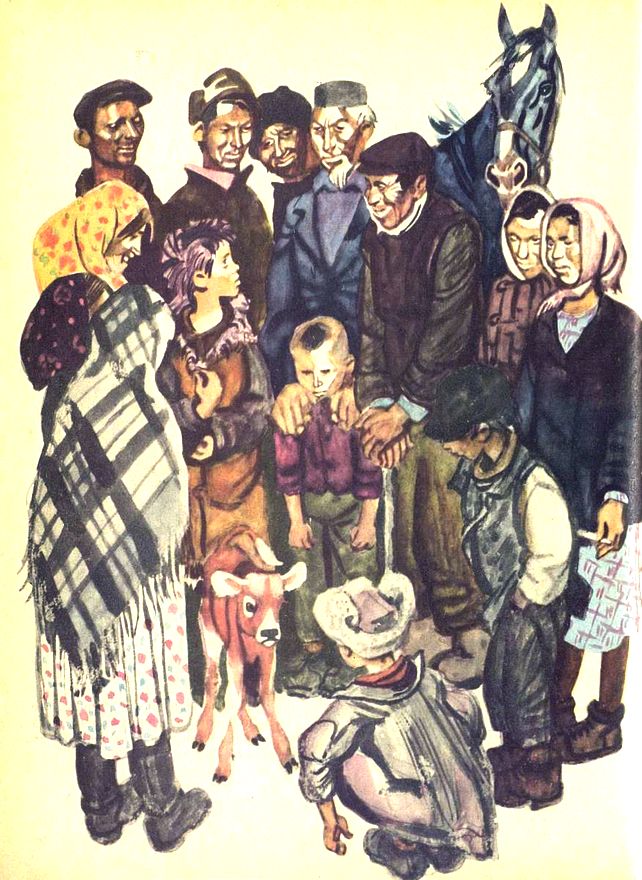 Когда мы подскакали, телёнок встретил нас дрожащим мычанием. Я соскочил наземь. Корова облизывала его, шумно дыша, а он тянулся к ней мордой и чмокал губами. Он смотрел большими выпуклыми глазами и дрожал с ног до головы, весь мокрый. Особенно сильно дрожали высокие тонкие его ножки: был он похож на какое-то насекомое именно из-за этих своих длинных дрожащих ног с непомерно толстыми коленками, которые всё время подгибались вот-вот упадёт!