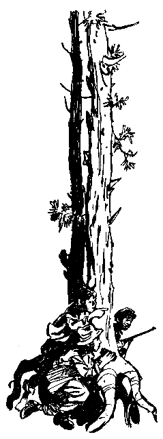 Димка спрятался за толстую сосну. Степа и Ленька присели за невысокой березой.