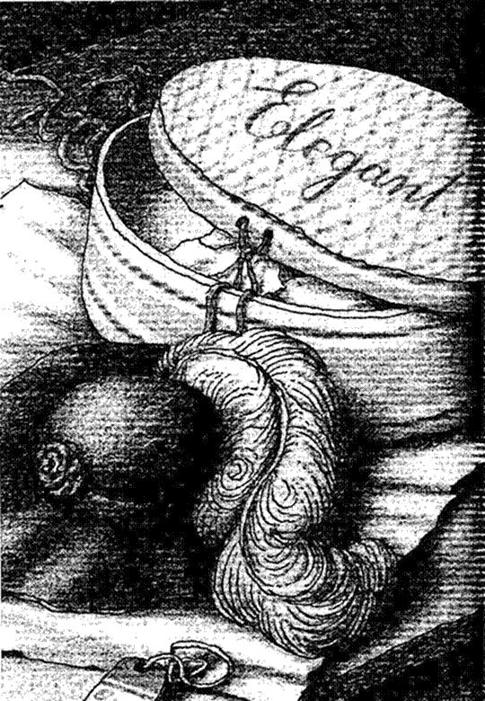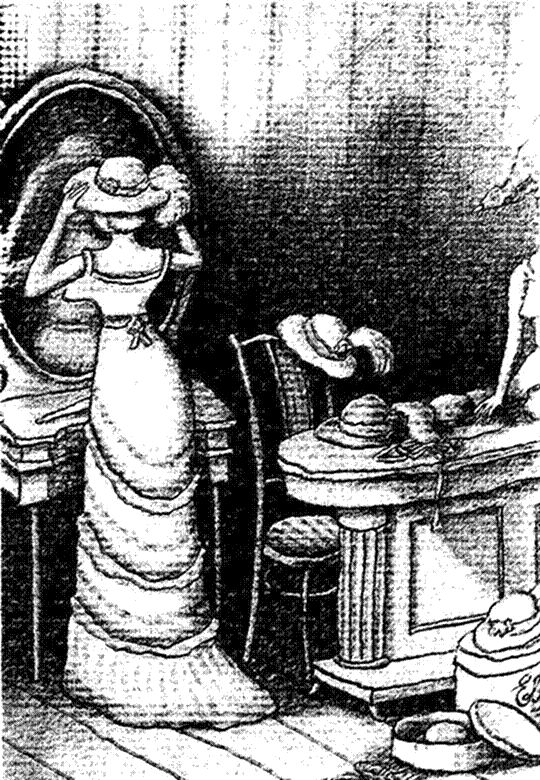 Задыхаясь, она взбежала наверх, разрезала веревки, сорвала папиросную бумагу и что же? там оказалась именно такая шляпа: большая, мягкая, с огромным изогнутым пером и черной бархатной розой ничего лишнего. Они были в восторге. Девушка примерила ее, а потом протянула Розабел.