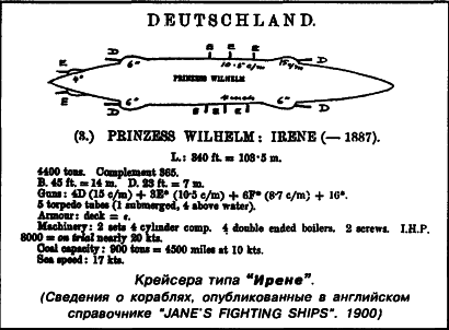 Два слова собственно о терминах. В Германии не существовало класса «броненосный крейсер». До 1899 г. было разделение на крейсера 1,2, 3, и 4 классов, с 1899 г. крейсера 1 и 2 классов становятся большими крейсерами. Следовательно, большими крейсерами были не только т. н. броненосные (10-15 тыс. т водоизмещения), но также и бронепалубные типа «Кайзерин Аугуста» «Виктория Луизе» (6 тыс. т водоизмещения) и линейного типа «Фон дер Танн» «Гинденбург» (20-30 тыс. т). Мало того, броненосные фрегаты 60-х годов XIX века постройки водоизмещением по 9000 т и скоростью, в лучшем случае, 10 узлов, после модернизации 1897 г. также стали большими крейсерами, хотя более походили на учебные суда.