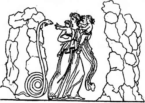 Змей Пифон преследует богиню Лето и ее детей, Аполлона и Артемиду.