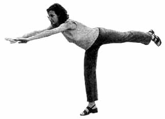 Стоим прямо, руки опущены. Разводим руки в стороны ладонями вниз. Отводим назад правую ногу. Стоя на одной ноге (ногу не сгибаем), наклоняем тело горизонтально. Руки, спина и отведенная назад нога