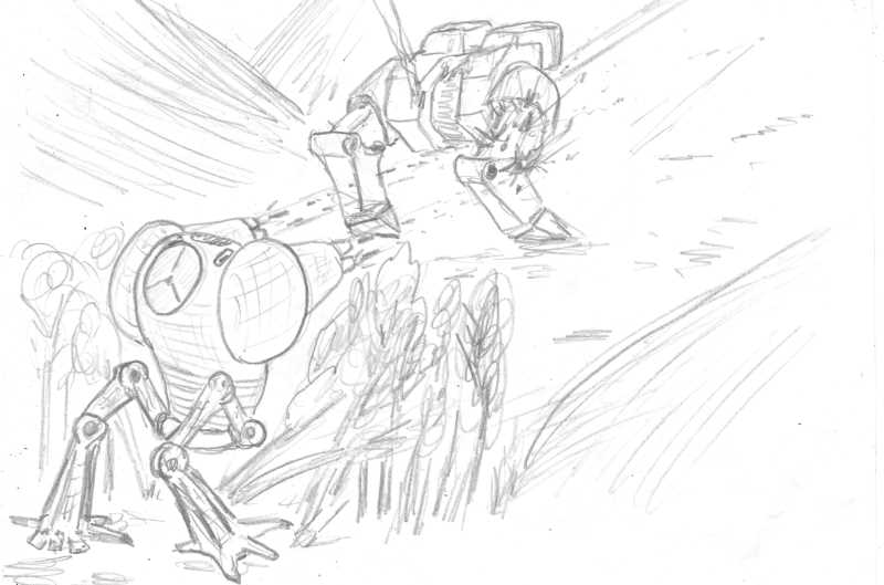 попробует ударить Гауссами, как только перезарядится. Одна из мин легла точно, вторая же ушла мимо, уцепившись за ствол изуродованного осколками дерева. На этот раз замысел оправдался. Вместо выстрела произошел мощный взрыв, который разорвал один из пилонов «МЭД»-а, отправив машину в нокаут. Второй же пилон испустил рукотворную молнию, но из-за смещения от взрыва, заряд Гаусса угодил в ногу «Охотнику». Тот, будучи в прыжке, задействовал свои РПУ, но использовал неуправляемые заряды, зная, что «прыгуны» противника так же оснащены системой подавления. 4 из 6-и ракет промазали, зато 2 оставшиеся поймали «МЭД»-а в прыжке как раз на излете, когда его траектория уже неплохо прогнозировалась. Ракеты ударили в хорошо защищенную лобовую плоскость машины, оторвав приличные куски металла. Выступивший нано-раствор контурной брони тут же зацементировал пробоины. Однако траектория приземления оказалось сильно смещенной. «МЭД» не рассчитал угол и неудачно налетел на крупный выпирающий на фоне остального массива черный ствол обгоревшего дерева. Разломав препятствие в щепки его развернуло на 90 градусов и повело боком так, что он чуть не завалился, но мастерски удержал машину, отставив левую ногу вперед по пути инертного движения. Сам «Охотник» потерял устойчивость в воздухе из-за сильного повреждения ускорителя в ноге, а поэтому, развернувшись, спикировал вниз прямо к туше поврежденного, но все еще опасного врага. Удержавшись при резком приземлении «Охотник» оказался чуть позади и нанес удар термо-клинком в тот самый момент, когда «МЭД» готов был использовать снова свои излучатели. Острый и раскаленный до бела меч вонзился в уже поврежденную фронтальную броне-плоскость вражеского робота. Тут же последовал удар разогретого воздуха от самого клинка из-за чего лезвие погрузилось еще глубже, достигнув кокпит и испепелив проводку и другие внутренности кабины управления. «Прыгун» затих и отключился. Головная часть машины объялась пламенем. С ним было все кончено. Оставшийся «МЭД» с разбитым пилоном ружья Гаусса попал в тяжелую ситуацию. Лежа на боку среди прутьев и веток кустарников, он не имел возможности самостоятельно встать. «Байпа» выждал немного, думая, что пилот, если он там есть, катапультируется.